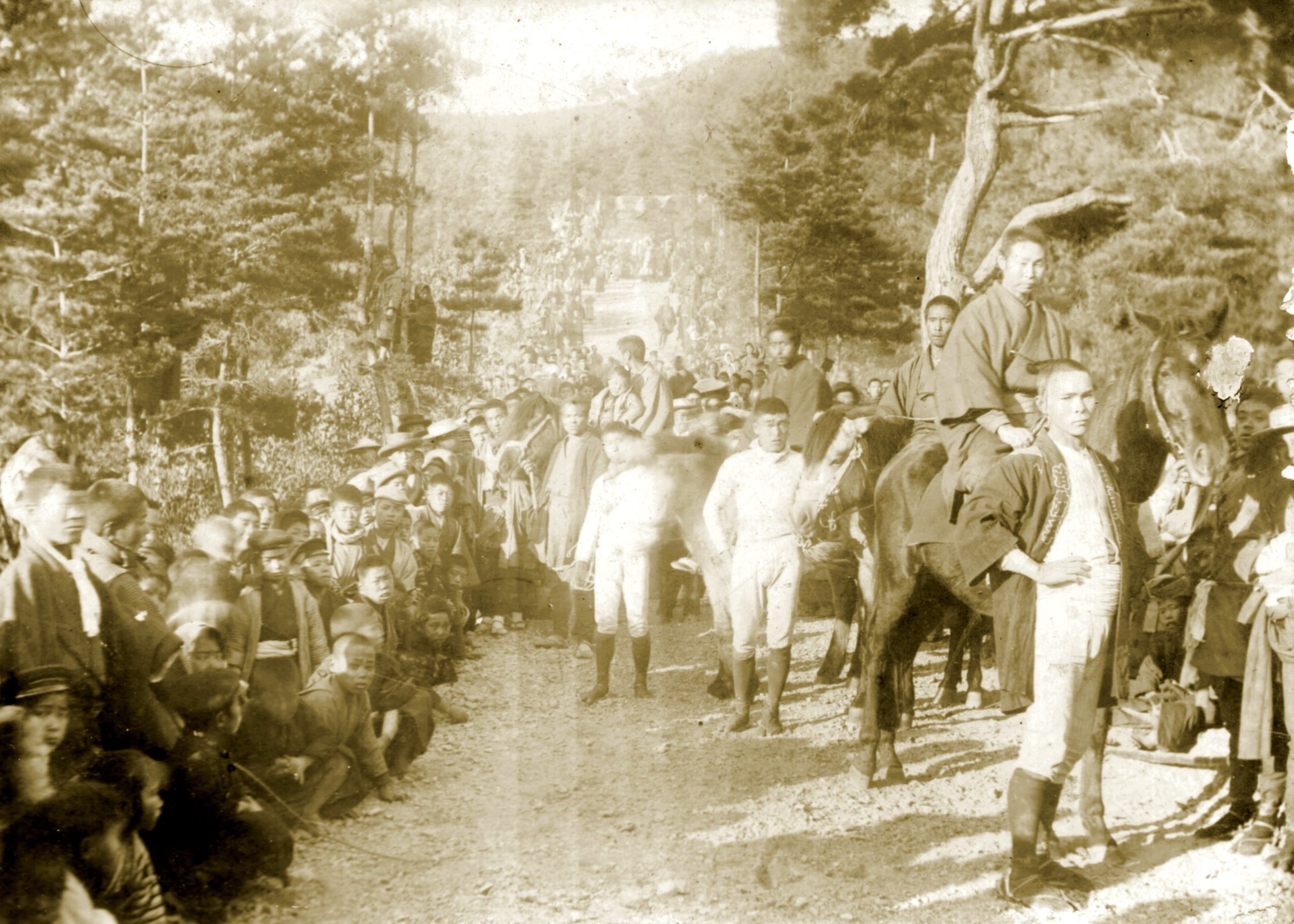 馬上で鞍にまたがる人、馬のたずなを引く人、それを遠巻きに囲み興味深々と覗き込む子供たちが、その頃まだ物珍しかったはずの写真機に注目しています。